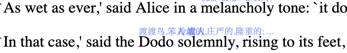 为了让读者尽可能原汁原味的欣赏英文书籍,该软件尽量不破坏原有的文字布局。中文释义是用小号字体展示在行间空白处。为了不影响阅读体验,注释的不透明度默认为30%。这样做的目的,是让读者一般情况下不会被释义干扰,除非特意去看释义。