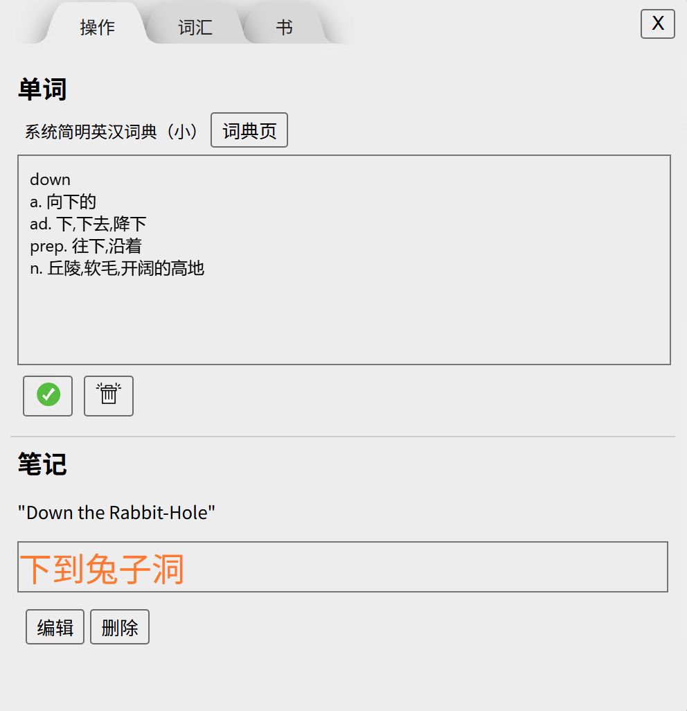 在内容页任意单词处点击鼠标左键,弹出对话框,可以对当前光标所在位置的单词或笔记(如果有的话)进行操作。 选择一段文本,弹出对话框,可以添加笔记。