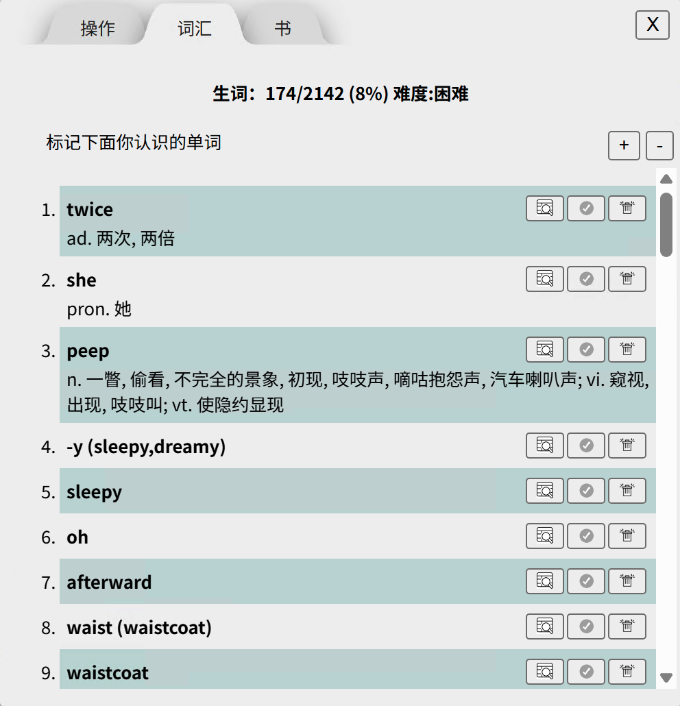 生词所占比例也会显示。如果比例较高,则说明阅读难度较高。一般来说低于3%是比较舒适的阅读体验。