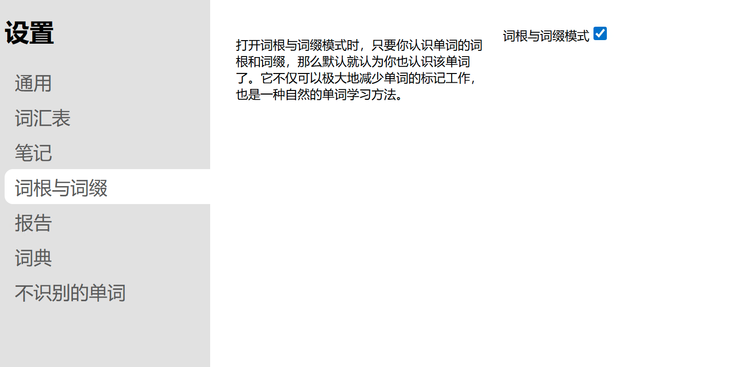 举个例子。启用词根词缀模式以后,如果你认识单词hope和词缀-less,那么软件就认为你也认识单词hopeless. 从而不需要对单词hopeless单独标记。