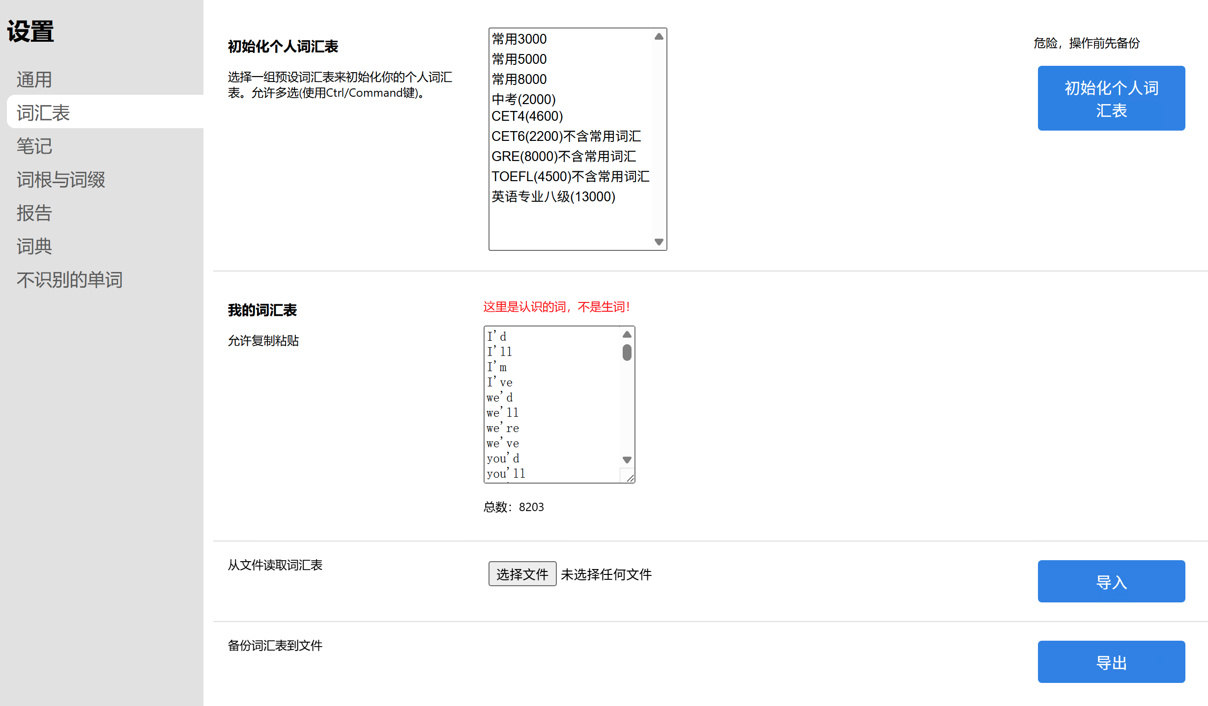 如何找到适合自己的词汇表?首先,要了解自己的词汇量水平。在了解了自己的词汇量以后,就可以在设置里相应的初始化词汇表了。注意,这个词汇表只是粗略的设置,想要更加精确的接近个人真实的词汇量,还需要后续的单词标记工作。一般来说,看完1,2本小说以后,集中的标记工作就告一段落了。