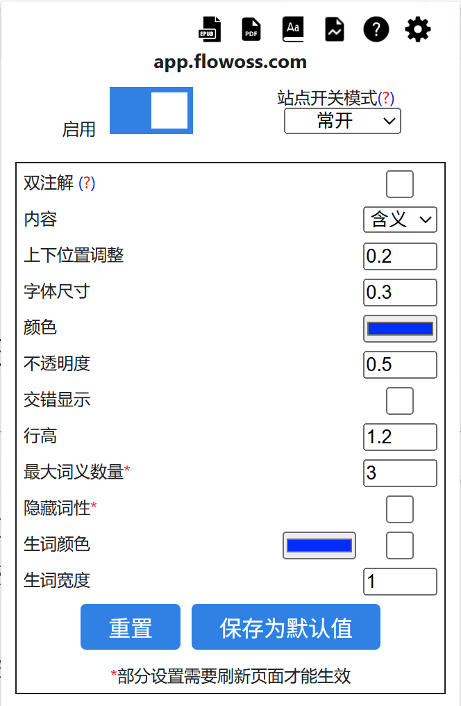 用户根据自己的习惯还可以调整当前网站的释义的位置,字体大小,颜色,不透明度等。