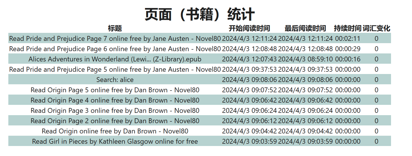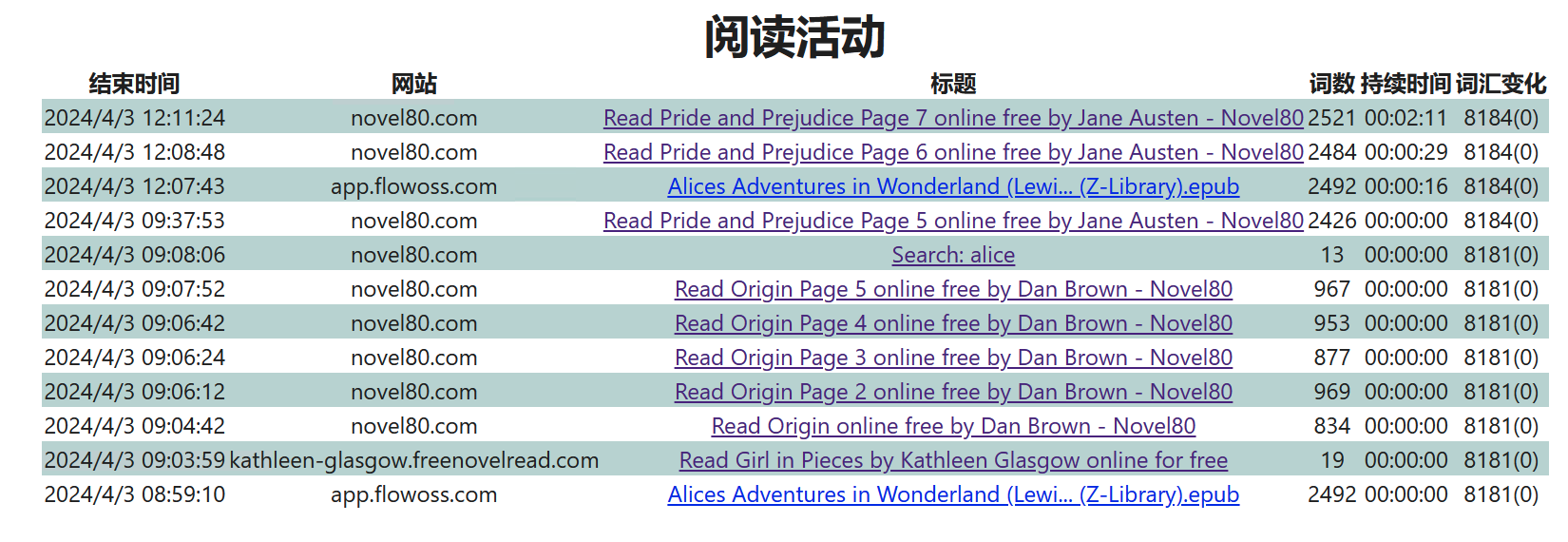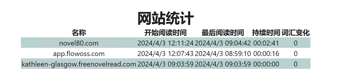 可以看到平时常去的英文网站,所花的时间和词汇量的增长。